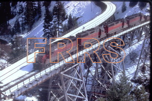 The ice is flying off the deck of the Indian Creek bridge as the KGT rips down the High Line at East Moccasin, minutes away from an engine and crew change at Keddie, the nippy 10o air giving extra impetus for an early quit. 12-9-72 Ted Benson