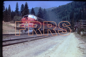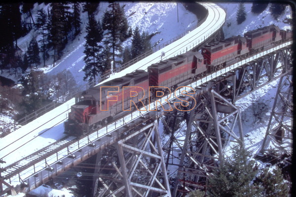 Twenty-four miles out of Keddie, First #54 works into Almanor station beneath the mountain bearing Arthur Keddie’s name. Two SP&S Alco Century 636’s and a pair of GP35’s from Great Northern and CB&Q supply a colorful 12,200 horsepower for the 81 cars of the pool train. 6/16/71. Ted Benson