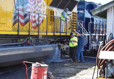 David Dodds washing the UP 3014 before moving it to display on the east side of the shop. MP 1982 will get washed next.