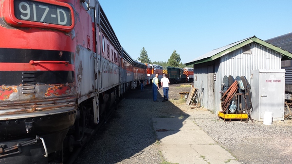 We fired up the WP 805A, WP 917D, WP 707, and WP 2001 for two photo trains. The first photo train was a "mini-Zephyr" with WP 805A, WP 925C dead in consist, and WP 917D as the HEP. Greg Elems was the engineer and Ethan Doty was the brakeman, conductor, and rear shove protector. The second train was a nine car freight with WP 2001, WP 712 dead in consist, and WP 707 as HEP. Charlie Spikes as the hogger, and Steve Parry was the brakeman and conductor.